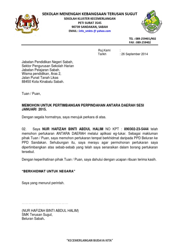 Tel Fax 06-4382077 RujTuanPPDR-700 4 6 RujKamiBil dlm SKLU 0206006 Tarikh. Contoh surat tukar sekolah picture uploaded ang uploaded by admin that saved inside our collection. Pdf contoh surat rayuan eg tukar zuebir.